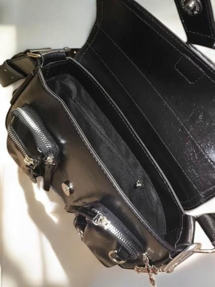 This bag features a sleek black design with gothic-inspired details, crafted for both style and functionality. Its versatile size makes it ideal for carrying essentials like wallets, phones, and small accessories. Whether you're stepping out for errands or dressing up for a night out, this bag is a stylish addition to any outfit.
